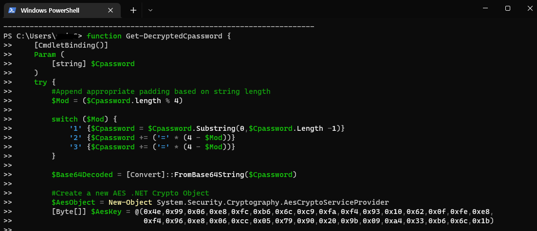 Get-DecryptedCpassword 'LjFWQMzS3GWDeav7+0Q0oSoOM43VwD30YZDVaItj8e0'