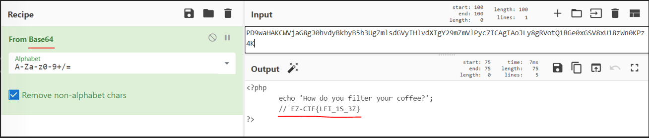 flag.php 파일을 읽어와서 base64로 인코딩한 뒤에 출력해라 정도로 해석하면 된다.