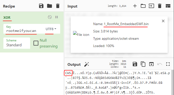 Input에 추출한 1_RootMe_EmbeddedSWF.bin 를 드래그 앤 드롭해주고,