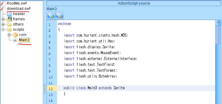 위에있는것이 RootMe.swf 파일의 전체 액션스크립트이다.