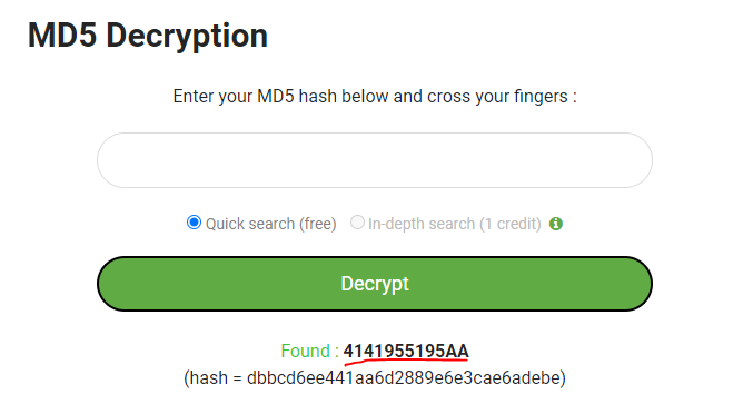 md5 해시의 원래 값은 4141955195AA 이다.
