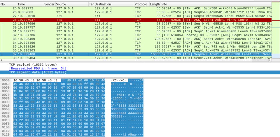 더 내려보니 37번째 패킷에서 jpg 파일 시그니처가 보였다.