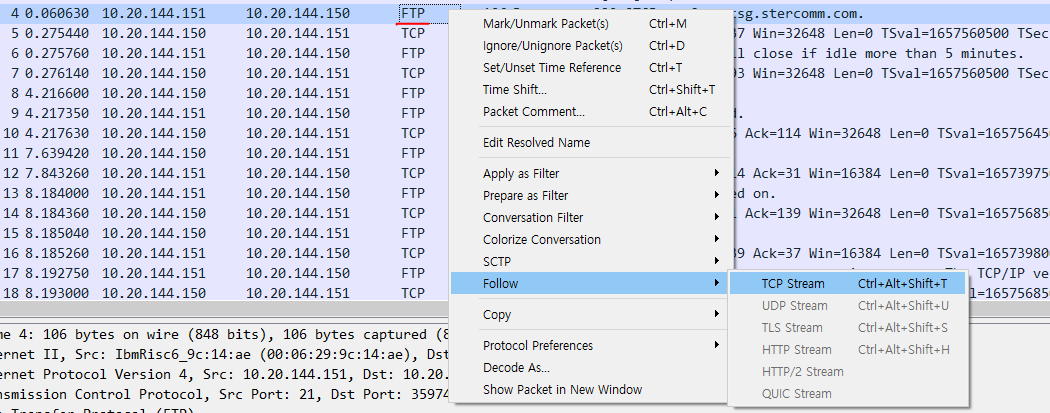 우클릭 - Follow - TCP Stream 을 눌러준다.