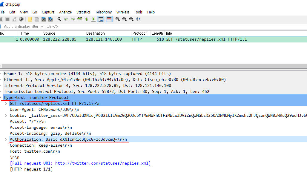 Wireshark 도구를 이용해 ch3.pcap를 열어보면
