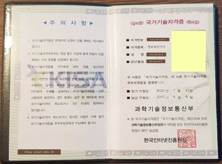 2020년 7월 아직 KISA에서 시험을 주관하던 시절 취득한 정보보안기사