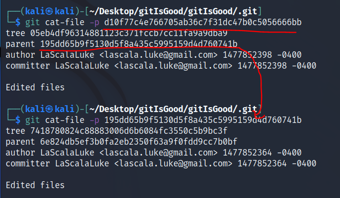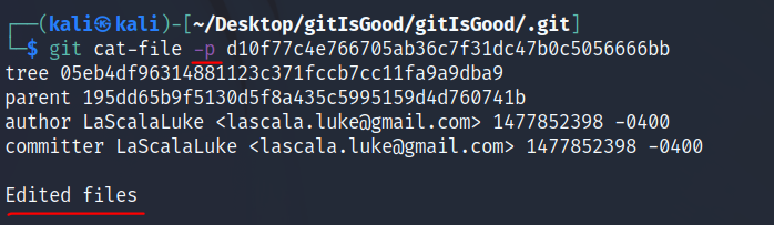 git cat-file -p <parent 해시값> 을 입력해본다.