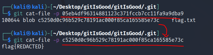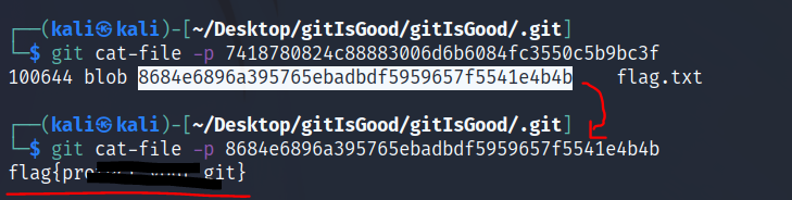 git cat-file -p <flag.txt 해시값>하면 flag.txt 파일의 내용을 볼 수 있다.