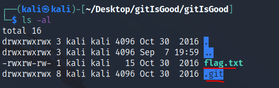 압축을 풀어보면 .git 디렉토리와 flag.txt 파일이 들어있다.
