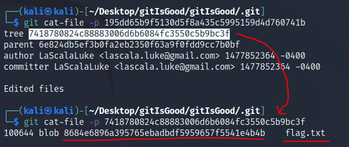 git cat-file -p <tree 해시값> 하면 flag.txt 파일의 해시값을 찾을 수 있고