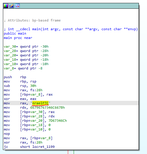 main 함수를 살펴보니 뭔가 ASCII 코드 같은 값을 레지스터에 mov 하는 행위가 보였다.