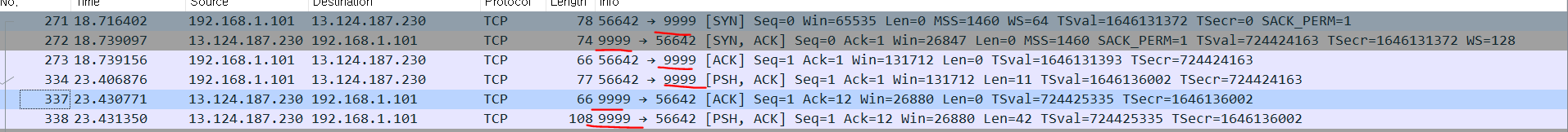 천천히 내리면서 살펴보면 9999번 포트와 통신한 기록을 쉽게 찾을 수 있다.