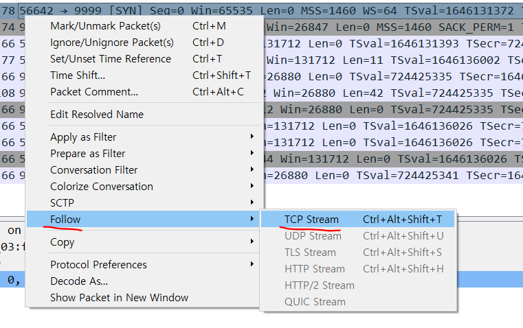 해당 패킷에서 우클릭 - Follow - TCP Stream 을 눌러주면