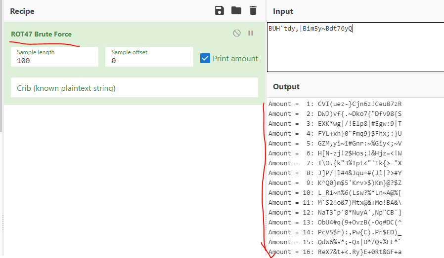 ROT47 Brute Force 라는 레시피를 이용해 확인해볼 수 있는데