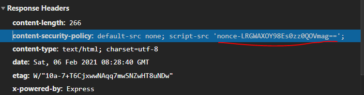 res.setHeader("Content-Security-Policy", `default-src none; script-src 'nonce-${NONCE}';`);