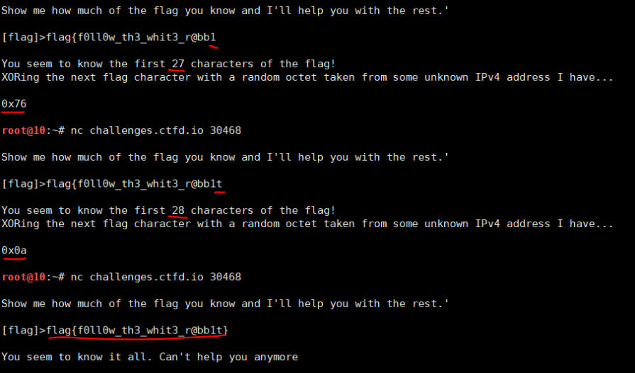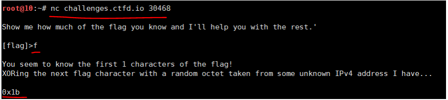 플래그의 그 다음글자를 어떤 IPv4 주소의 랜덤한 부분과 XOR 한 결과를 알려준다.