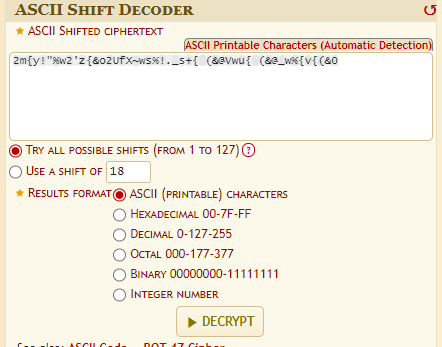 Decode.fr(https://www.dcode.fr/ascii-shift-cipher) 에서 이렇게 입력을 넣어주고