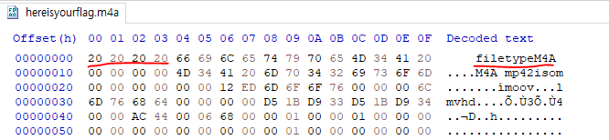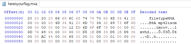 문제에서 주어지는 것은 hereisyourflag.m4a 파일이다.