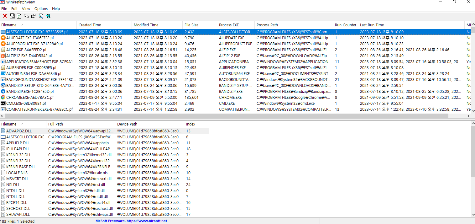 실행된 응용 프로그램, 실행된 시간, 경로, 횟수 등을 알 수 있다.