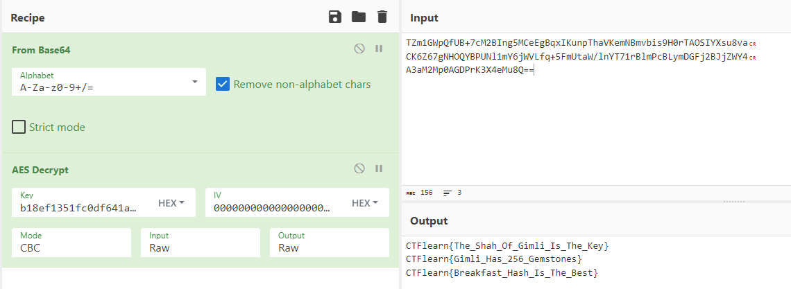 CyberChef에서 해당 블럭을 AES Decrypt 해준다.