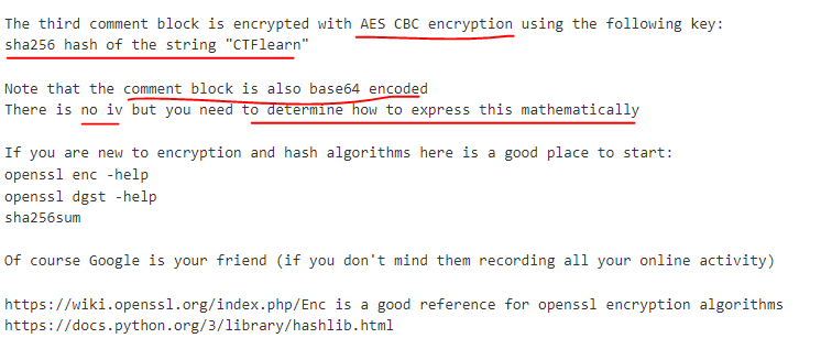 세번째 코멘트 블럭은 AES CBC로 암호화되어있고