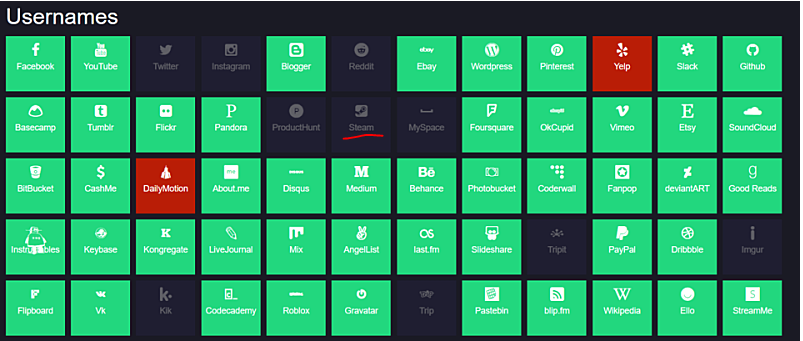 검정색은 이미 해당 이름과 중복되는 계정이 존재하는 사이트를 의미한다.
