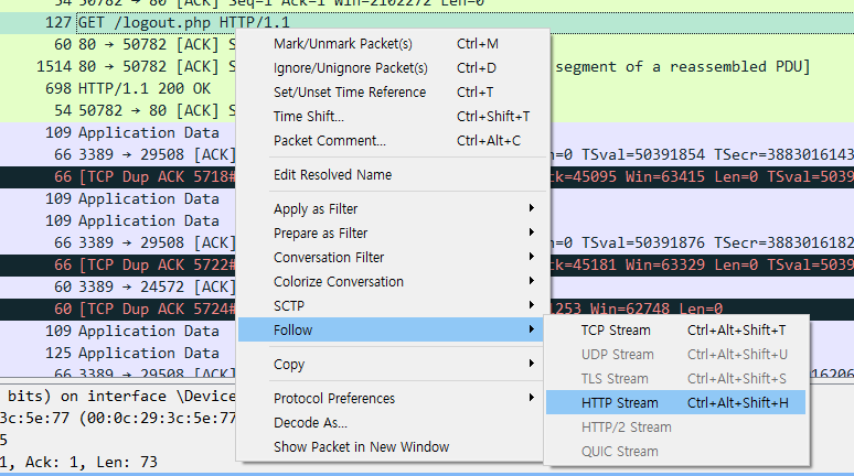 우클릭 - Follow - HTTP Stream 눌러 자세히보면