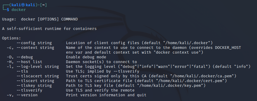칼리 리눅스에서 터미널 창을 열어서 docker 라고 입력해본다.