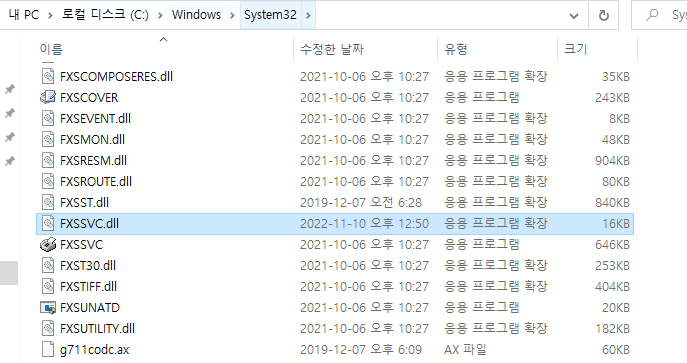 해당 경로에 가보면 FXSSVC.dll 이 있는걸 볼 수 있다.