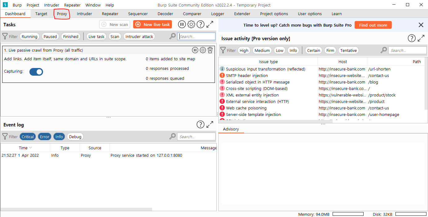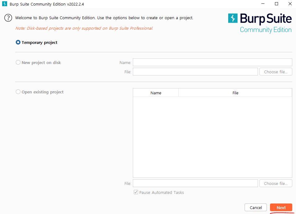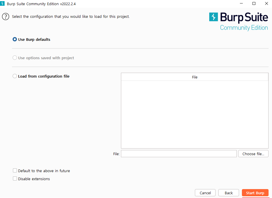 안해도된다. Start Burp 버튼을 눌러준다.