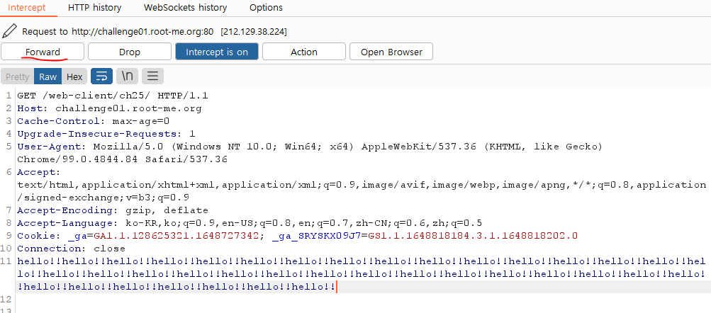 서버로 패킷을 날리려면 위에있는 Forward 버튼을 눌러주면 된다.