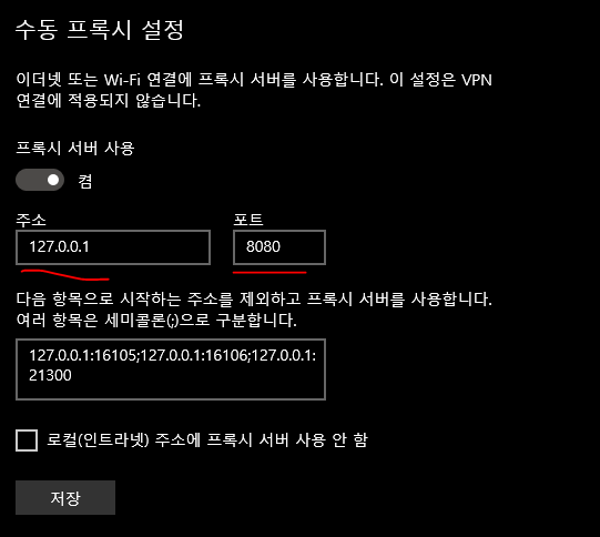 수동 프록시 설정에서 주소와 포트에 127.0.0.1 / 8080을 입력해준다.