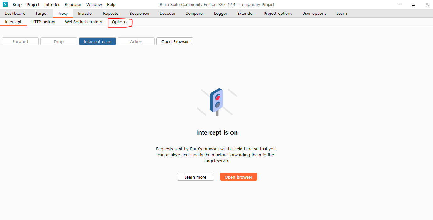 Proxy 탭 하위메뉴인 Options 메뉴를 눌러 들어가준다.