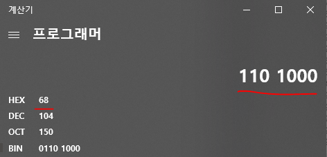 계산기에서 보면 01101000 이라는 값은 16진수로 68 인걸 확인할 수 있다.
