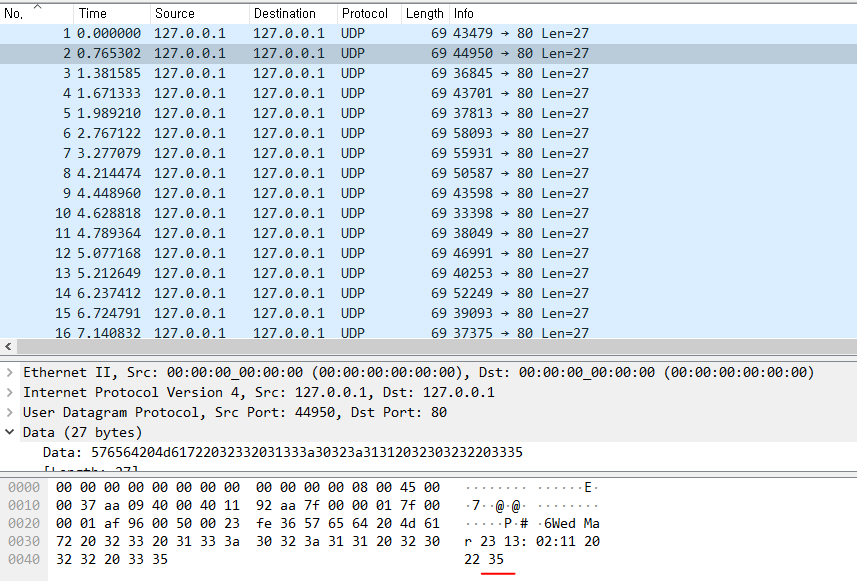 추출하면 UDP 패킷이다보니 위에 보이는것처럼 hex값 그대로 출력이 된다.